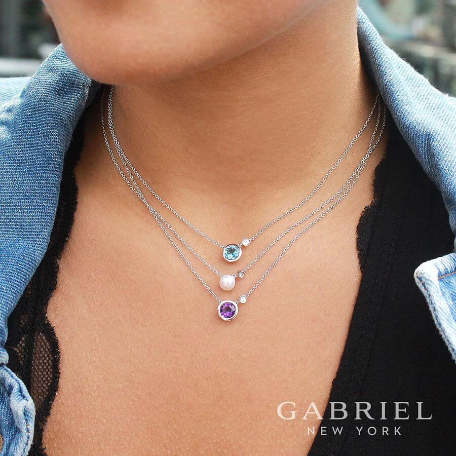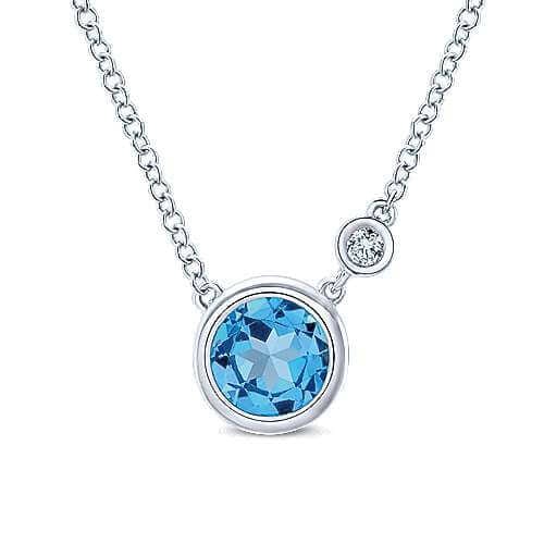 925 SILVER GABRIEL & CO ROUND BEZEL SET SWISS BLUE TOPAZ & DIAMOND PENDANT NECKLACE